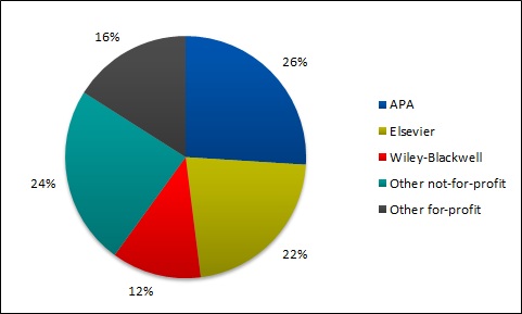 As can be seen in the Figure 1, the biggest publisher (26%) in the top fifty list is the American Psychological Association (APA), as one would expect. The next single entity that publishes the most journals in the list is Elsevier with 22%, followed by biggest single publisher (12%) -- Wiley-Blackwell, another privately owned company. Other, smaller for-profit publishers issue 16% of the journals, and they are trumped by other smaller learned societies and university presses which combined (excluding APA) publish 24% of the journals the our list.