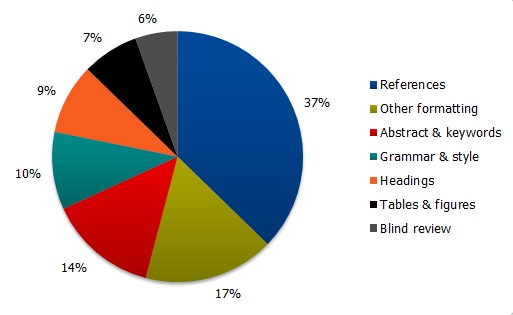Manuscripts submitted to JEPS go through what we call a technical review, which means we’ll check if they agree with our submission guidelines and APA Style. We give authors feedback on changes to be made, and the data presented here is based on this feedback. As it can be assumed the students submitting to JEPS tend to be more knowledgeable about the APA formatting rules than an average student, I'd therefore urge readers not to apply this data on all psychology students. This merely shows what should students pay most attention to when formatting their work according to the guidelines provided by the American Psychological Association.