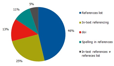 Thirty seven per cent of manuscripts submitted to JEPS this year had had some difficulty with referencing. In fact, when the two new categories are excluded, referencing errors would constitute again 51% of all mistakes made, like they did in the 2010 analysis. Referencing then clearly poses a major problem for students submitting to JEPS. At the same time, the referencing errors differ in their character (see Figure 2) which also illustrates the complexity of this category.